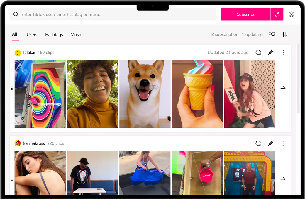 从TikTok下载内容 4K Tokkit是终极TikTok下载工具。下载高质量的TikTok挑战、字幕、完整帐户、标签、歌曲相关视频和单曲视频。 下载TikTok标签视频 从TikTok标签保存TikTok挑战视频和其他内容。获取MP4格式、高达720p分辨率的TikTok视频。 下载TikTok用户视频 从TikTok帐户批量下载视频。保存个人资料中的所有视频并抓取TikTok用户的头像。 备份TikTok帐户 只需单击一下,即可从您的个人资料下载每个TikTok视频。保存TikTok头像并导出下载历史记录。 4K TikTok其他功能自动下载TikTok视频 随时了解您喜爱的TikTok创建者和标签的更新。自动检查新视频,每天抓取新鲜内容,无需举手。 按日期下载TikTok视频 在应用内日历中调整下载日期范围。仅下载在指定时间段内发布的视频。 保存TikTok视频字幕 下载带有原始字幕的TikTok视频。将光标悬停在视频图标上以查看应用程序中的标题并将其复制到剪贴板。 下载有相同音乐的剪辑 抓取与特定音频相关的所有TikTok视频。输入歌曲名称以开始保存以该曲目为特色的所有TikTok视频。 单独保存TikTok片段 一次保存一个TikTok视频。输入TikTok视频的链接,并将其作为单个文件下载到您的计算机。 访问私人内容和推荐剪辑 保存推荐给特定TikTok用户的视频。从您关注的私人TikTok帐户下载视频。 更改TikTok位置 浏览和下载在其他地理区域流行的TikTok视频。使用内置代理设置切换到其他国家/地区。 |
