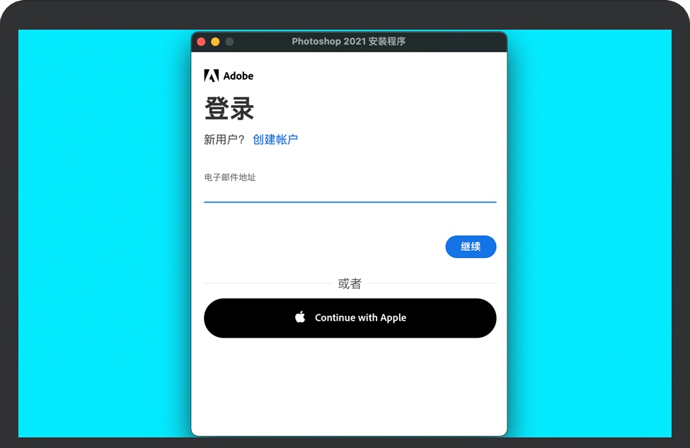 输入开机密码之后,会提示登录Adobe ID,没有的话可以点击“创建账户”注册一个,或者直接点击“Continue with Applie”。