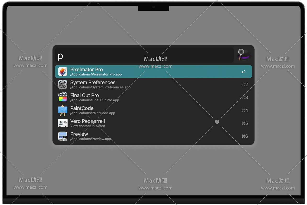 在 Alfred 查看来自 Google 和 Amazon 等网站的搜索结果,或为您自己喜欢的网站和服务创建搜索。通过 Mac 上的应用程序查找最近使用的文档。
