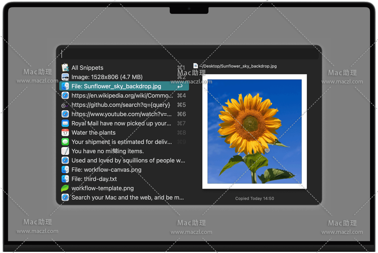 通过键入短关键字自动扩展文本片段,或在Alfred的片段查看器中浏览它们。使用Cmd+S从剪贴板历史查看器中保存它们。