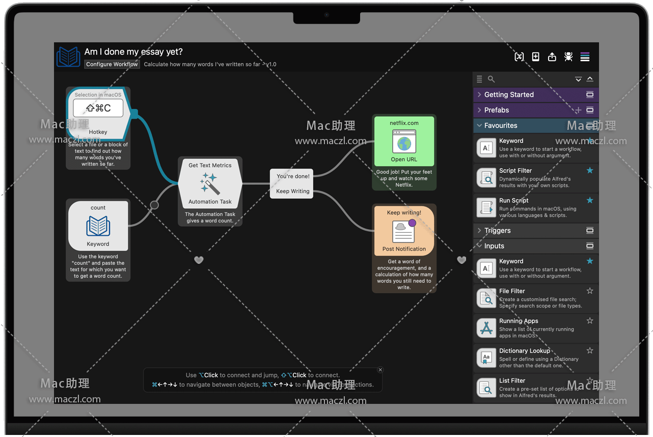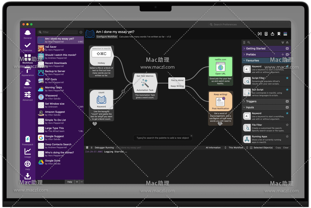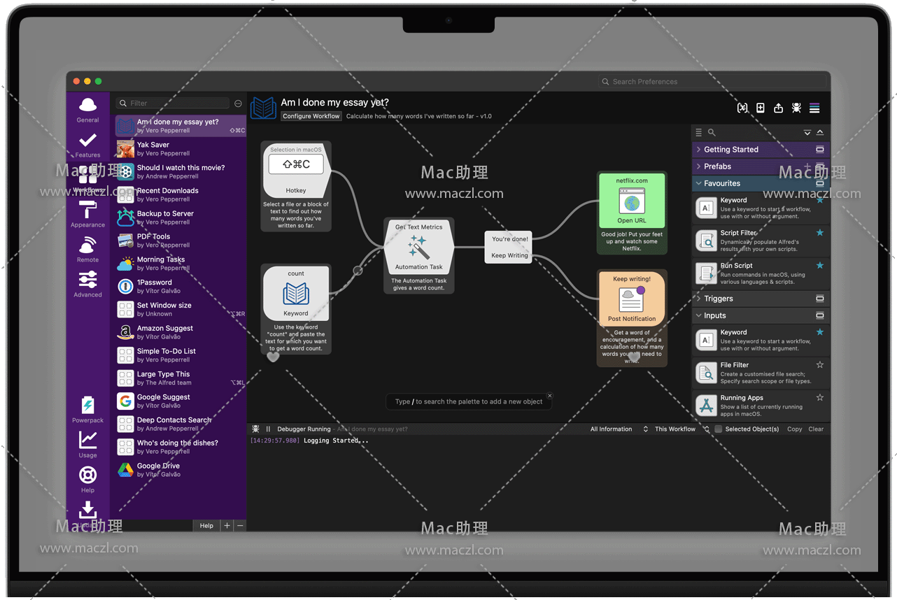 使用自定义热键和关键字消除重复性任务。导入由 Alfred 社区成员创建的数千个工作流中的一些或创建您自己的工作流。