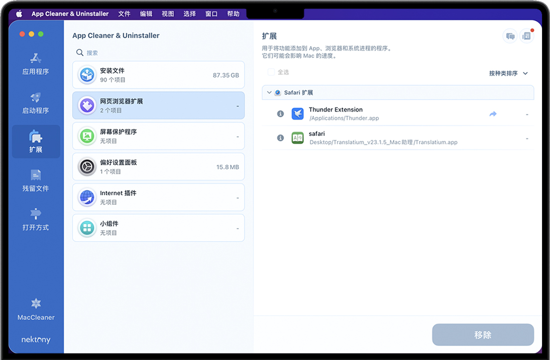 App Cleaner & Uninstaller for Mac 是一款简单易用的macOS软件卸载应用程序。这个轻量级应用程序在清除应用程序卸载时留下的链接、文件和其他垃圾方面做得很好。顾名思义,它还允许您从一开始就干净地卸载应用程序,并设置启动时启动的应用程序。删除Mac上的软件不仅仅是将应用程序拖到垃圾箱。如果你想从Mac上完全删除应用程序及其所有偏好、缓存和其他部分。卸载Mac软件的不二选择,强烈推荐各位新老用户下载安装,App Cleaner & Uninstaller 8在Mac助理网站免费提供后续的更新升级下载。