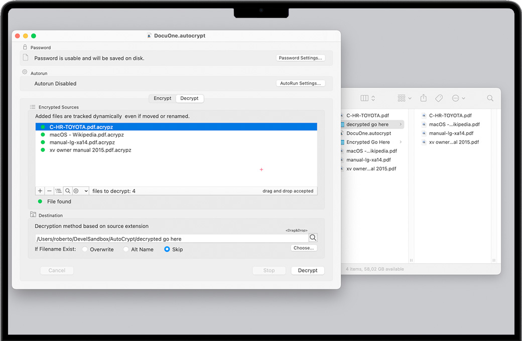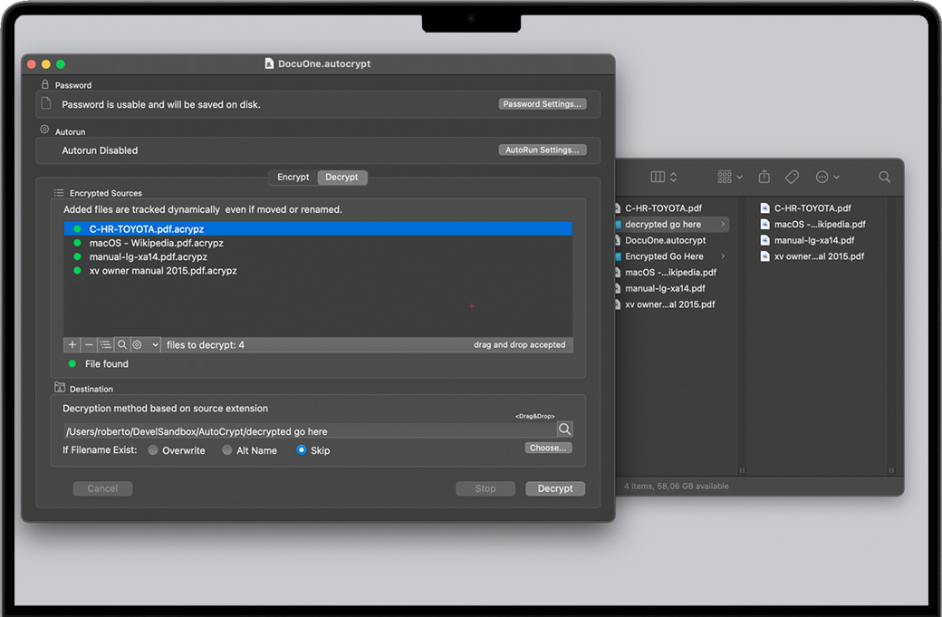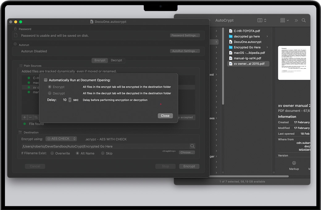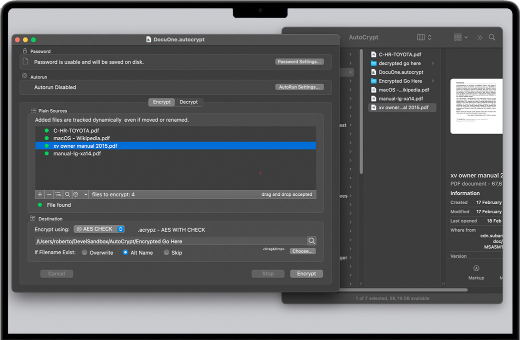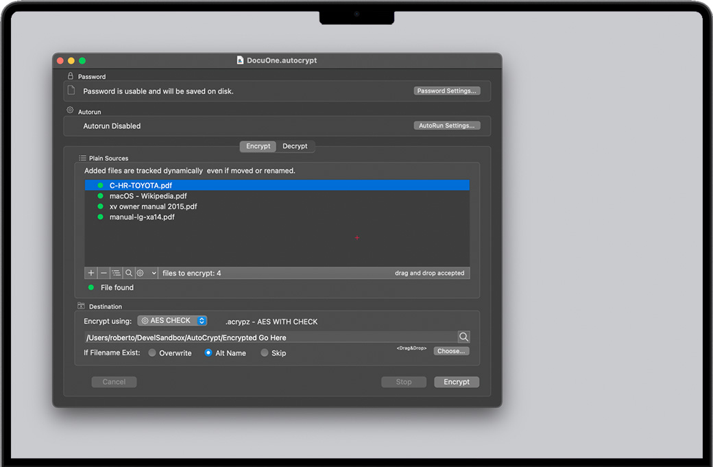 • 用于加密原始文件的所有设置都保存在 AutoCrypt 文档中。
