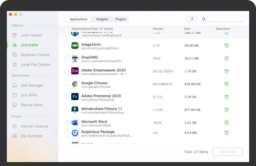 智能扫描会发现你 Mac 内部的每一个字节的垃圾,包括系统垃圾、应用垃圾、iTunes 垃圾、垃圾箱垃圾、电子邮件垃圾。只需让 AweCleaner 删除所有垃圾文件即可释放磁盘空间并加速您的慢速 Mac。