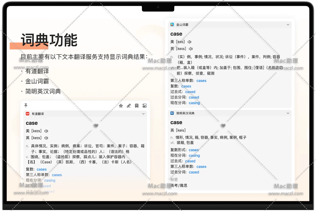 • 查词:Bob 不只是支持翻译,如果对应的翻译服务提供的信息够多,其实你也可以把 Bob 当做简单的查词工具使用