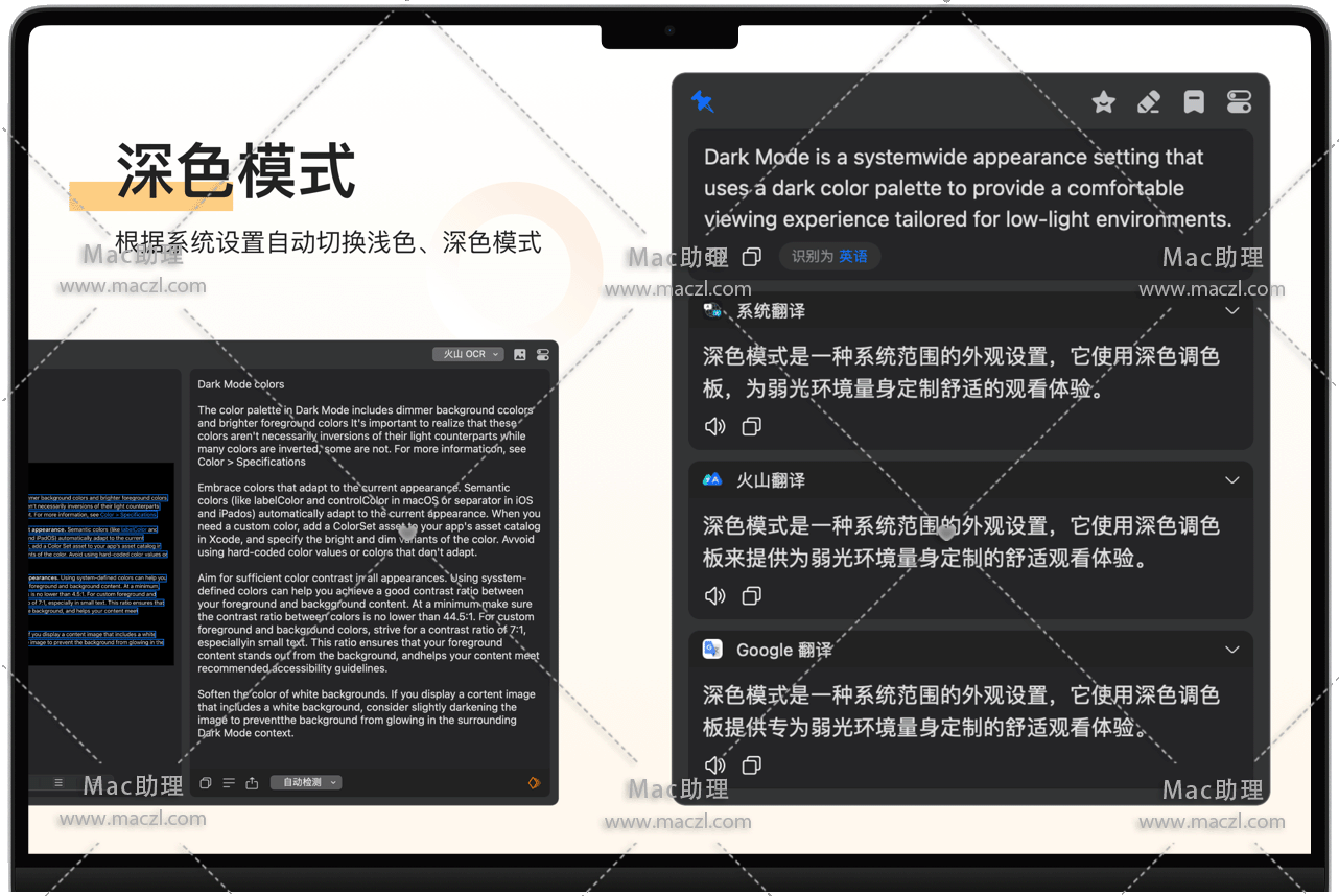 • 截图翻译:按下截图翻译快捷键(默认 ⌥ + S),截取需要翻译的区域即可翻译