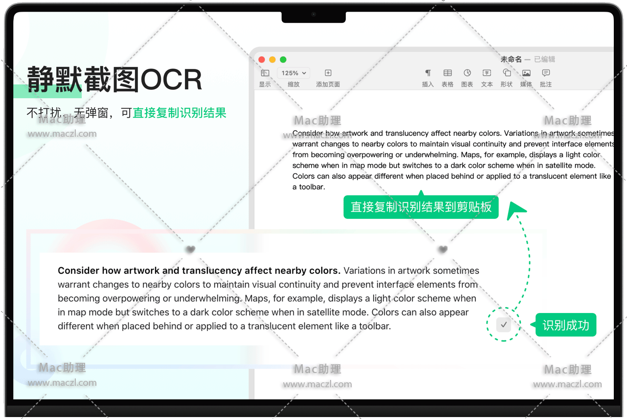 • 静默截图 OCR:按下静默截图 OCR 快捷键(默认 ⌥ + C),截取需要识别的区域即可后台识别文本