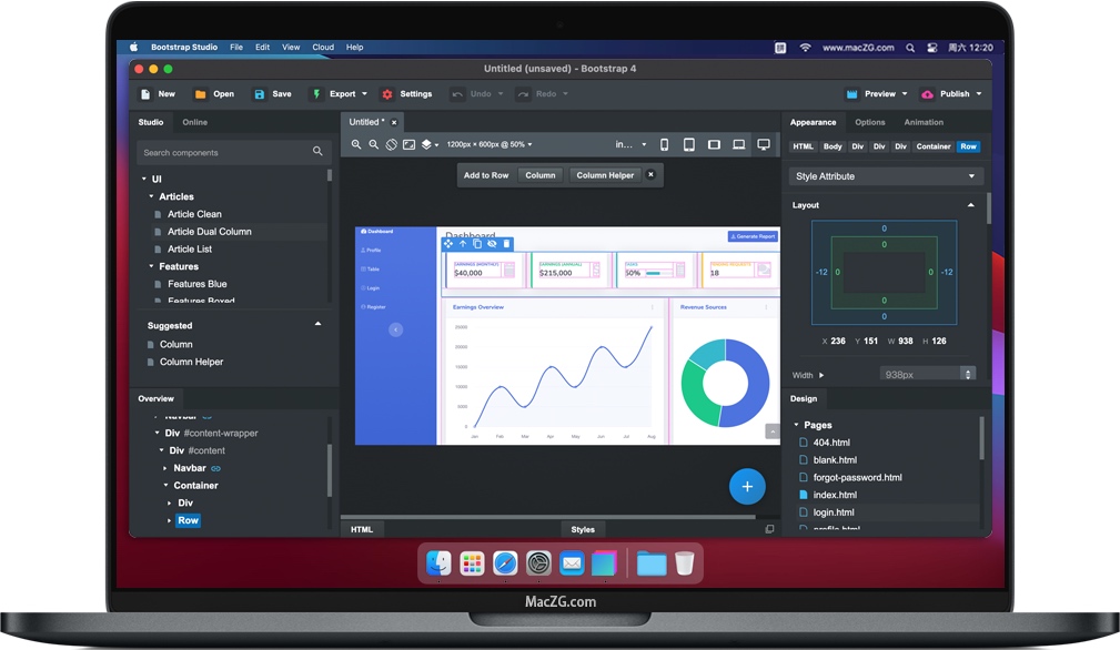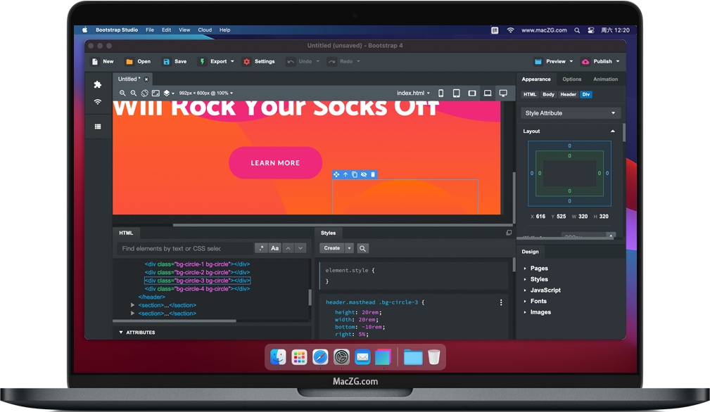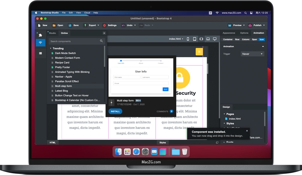 Bootstrap Studio for Mac 是一款功能强大的桌面应用程序,用于设计和制作网站原型。它带有大量内置组件,您可以将其拖放以组装响应式网页。该应用程序是在广受欢迎的Bootstrap框架之上构建的,并可以导出干净的语义HTML。