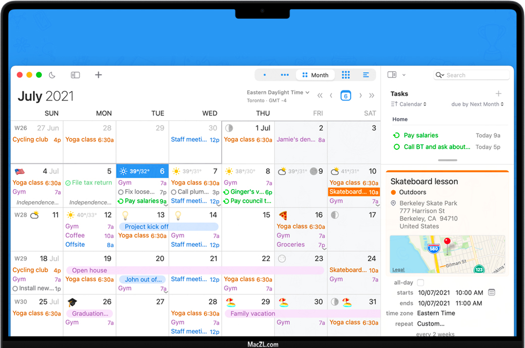 BusyCal 的信息面板让您可以快速、准确地查看和编辑事件详情。信息面板可以显示在侧边栏中,也可以作为弹出窗口或浮动窗口显示。而且它完全可自定义,您可以从多种属性中选择以显示,包括时区、标签、地图、私人笔记、上次编辑时间等。