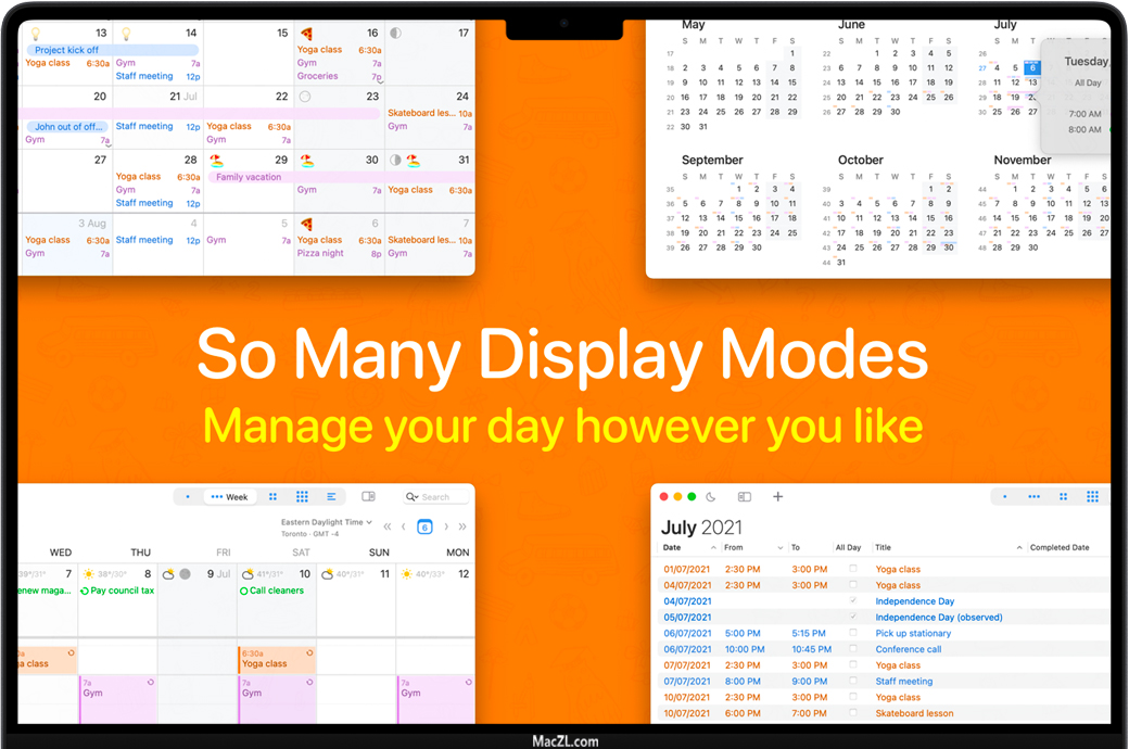 BusyCal 按天、周、月、年和列表视图显示日历。BusyCal 的独特之处在于它能够自定义这些视图从而更精确地满足您的需求。 您可以选择每月显示的周数或者每周显示的天数,并且您甚至可以通过选择字体及其大小、日历颜色、时间格式等自定义日历的外观。