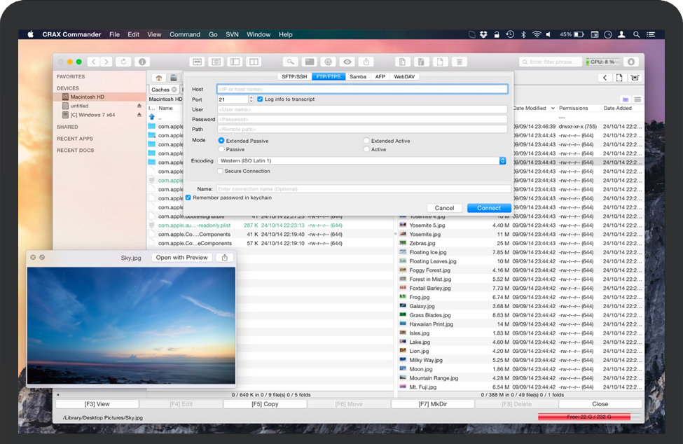 CRAX Commander for Mac 是一款苹果双窗口文件管理器,具有可接近的用户界面。它与Subversion集成,并具有内置的FTP/FTPS、SFTP/SSH、WebDAV、SMB和AFP客户端功能。CRAX Commander提供了快速有效地访问和管理本地和远程文件所需的许多功能。使用CRAX Commander,文件管理比以前更快、更简单。