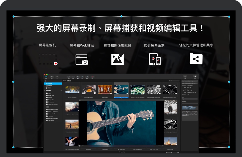 Capto for Mac 是一款全新的屏幕捕捉、屏幕录制和编辑应用套件,是创建信息量大、引人入胜的捕捉视频的最佳选择。Capto Mac的核心功能是视频录制与编辑,Capto for Mac还拥有很多其他的功能,支持全屏和区域录制,录音,定时录音。支持视频编辑以及注释,支持全屏及选择捕获,网页捕获。支持图像编辑,注释。可以建立智能收藏夹,保存文件信息。支持在线平台共享,服务器共享等等。