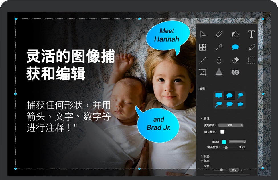 Capto有一个功能齐全的图像编辑器来增强和创建信息丰富的图像。高亮、注释、修正或调整捕获的屏幕截图的属性,使其脱颖而出。