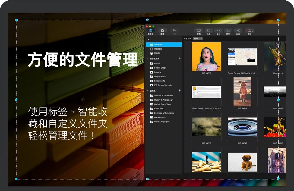 Capto自带一个简单的文件管理器,可以轻松存储和检索屏幕截图和录音。每一张截图和视频都会被分类到智能标签的文件夹中,并可自定义。