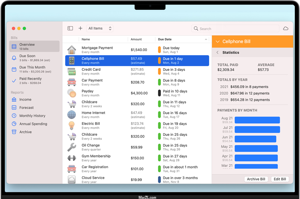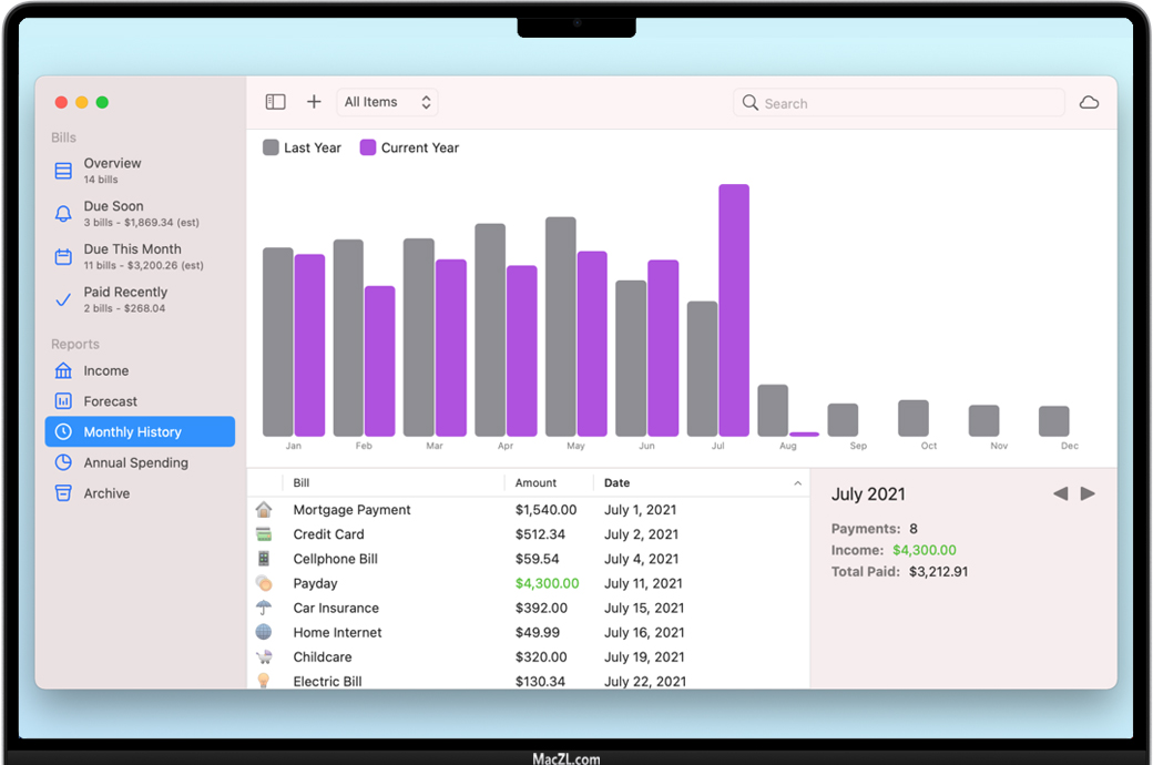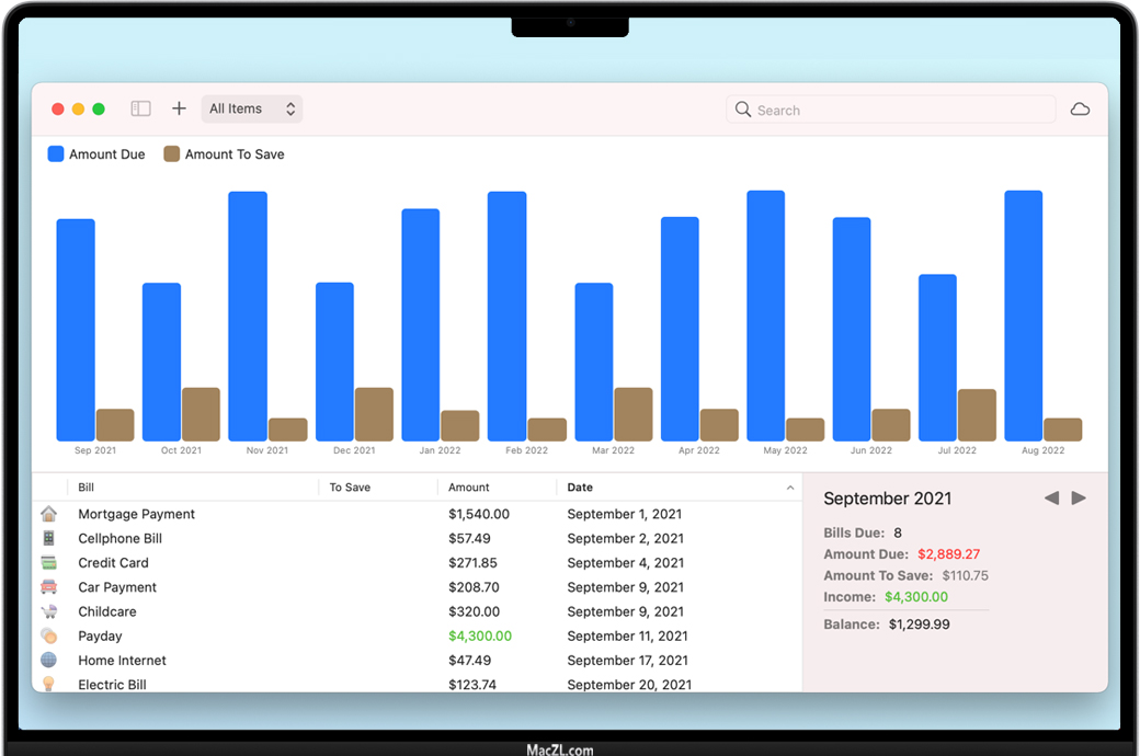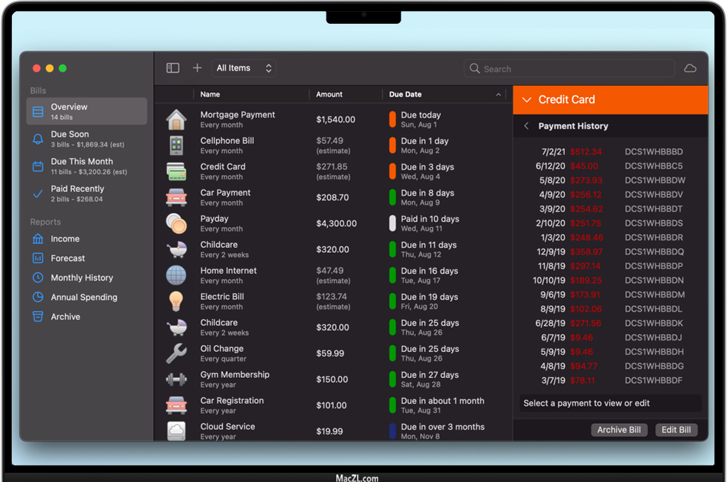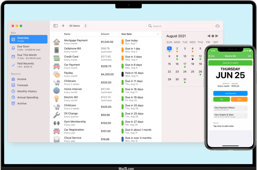 在几秒钟内安排所有账单,在菜单栏中访问即将到来的账单。将账单放在日历上,安排它们,查看付款统计数据并附上收据。跟踪你的财务状况。