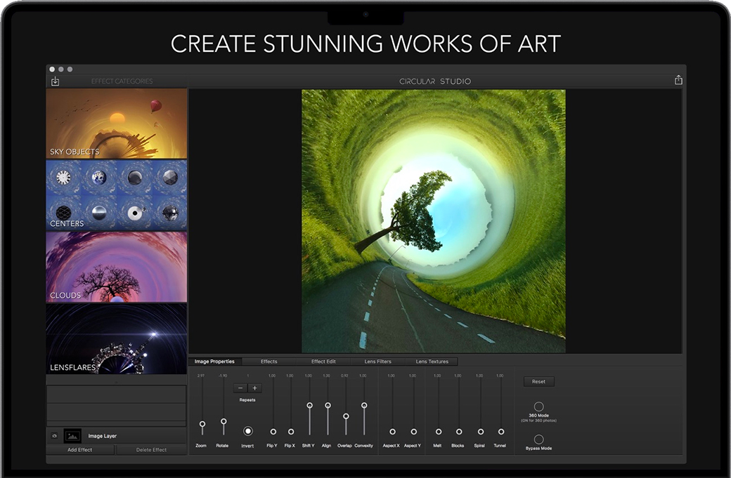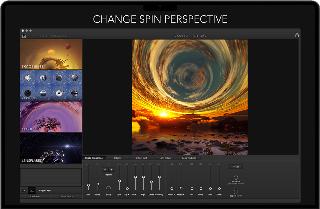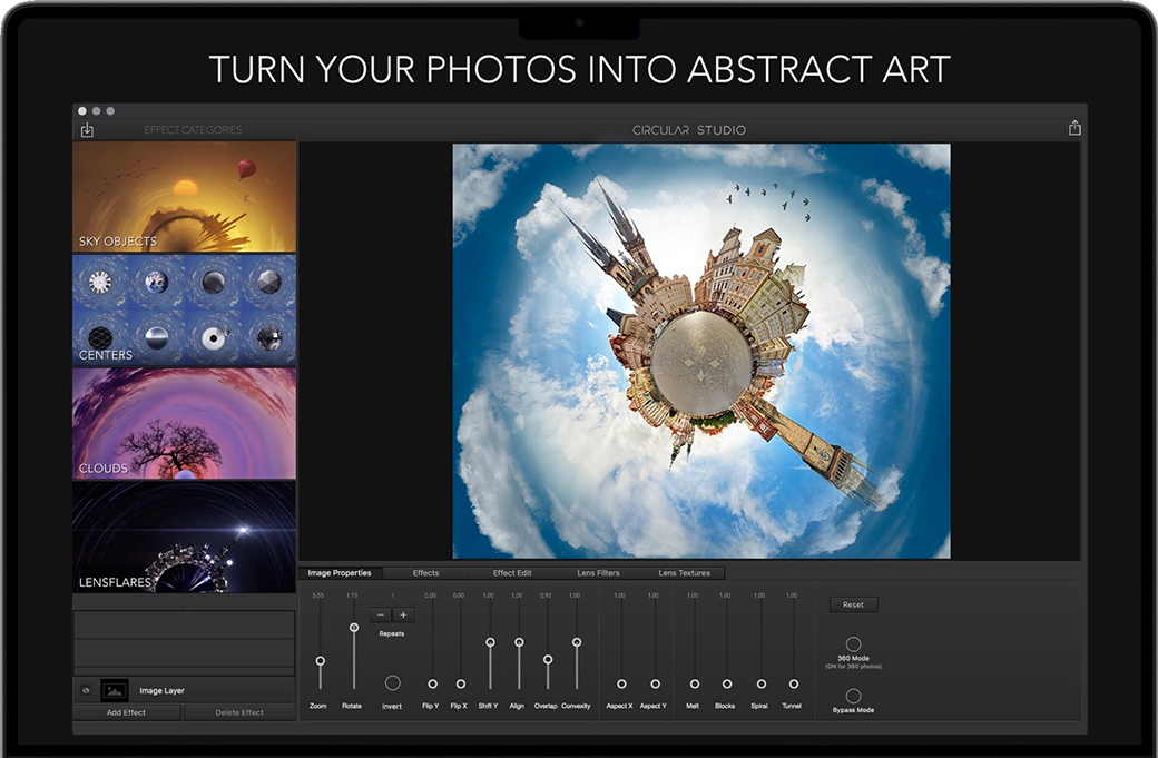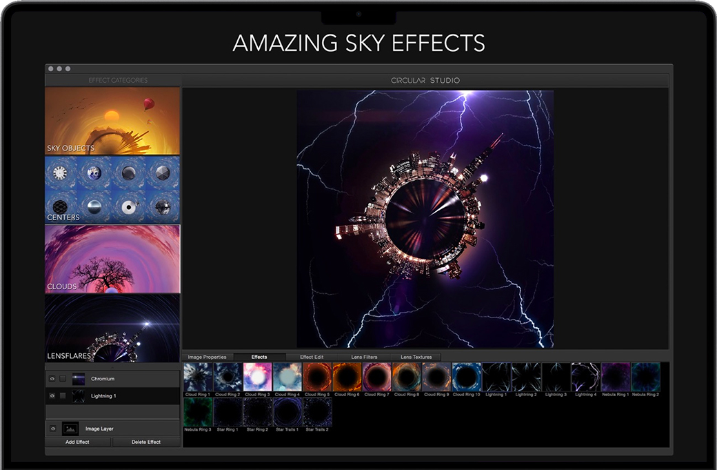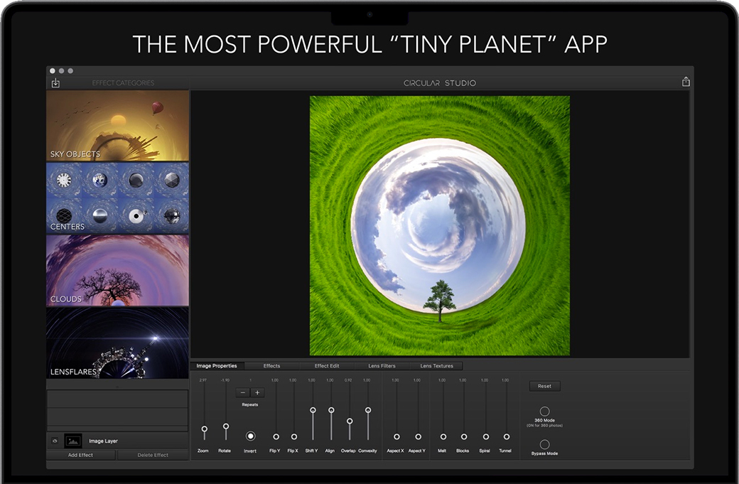 Mac上最强大的“小星球”应用程序。Circular Studio是照片编辑的新转折点。把你的照片变成惊人的圆形图像。 Circular Studio是一款有趣的应用程序,具有这类应用程序从未见过的强大的新功能。您可以轻松地放大和缩小圆形图像,使其恰到好处。一旦你对图像满意,就可以添加像太阳,月亮,鸟类等镜头闪光和天空物体等专业效果。 另一个非常酷的功能是“中心”物体的集合。这些包括放置在图像圈中心的球体,行星和几何形状。这将您的图像变成一个独特的迷你世界。 特征
