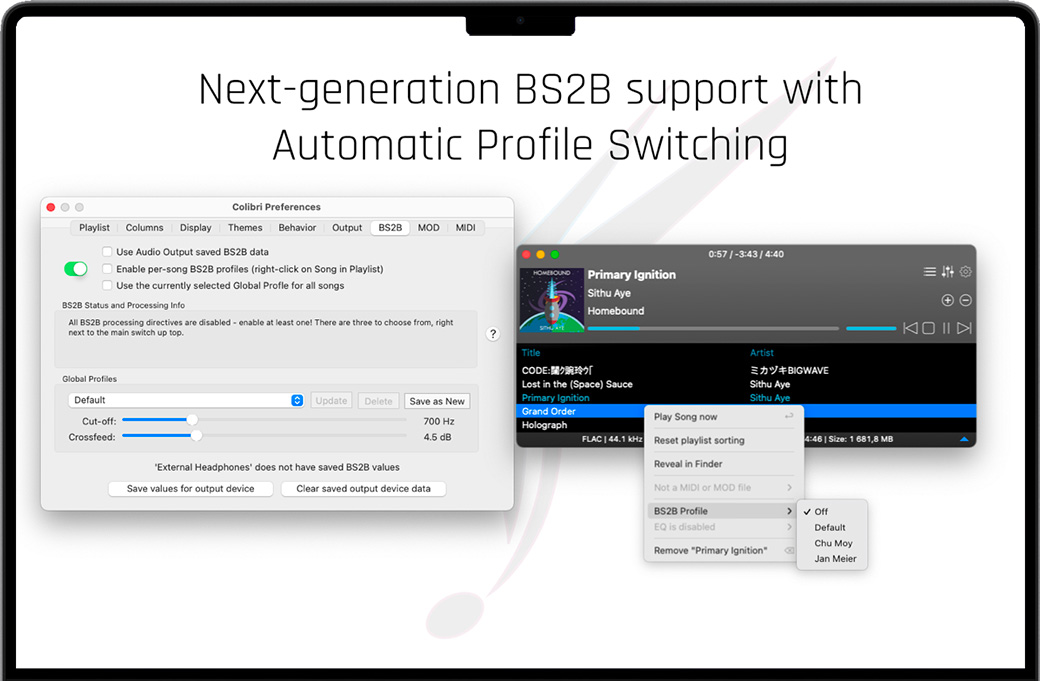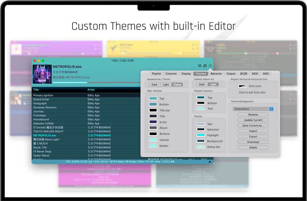 能够按照预期显示的方式呈现歌曲信息:在所有尝试过的元数据中,它在显示西里尔字母或汉字/片假名/平假名字符与 ASCII 混合时没有问题。Colibri 支持 BASS 引擎和 macOS 可读的所有已知元数据类型。