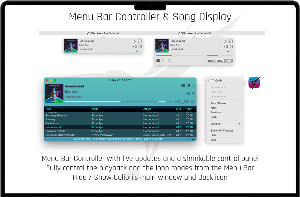 Colibri 可以在菜单栏中放置一个不显眼的小图标,以便于访问和控制播放列表:您可以开始/暂停播放、跳到下一首曲目或返回上一首曲目。它还显示当前歌曲的信息和封面图片。使用 MenuBar Controller 从甚至多个 Spaces 桌面控制 Colibri!
