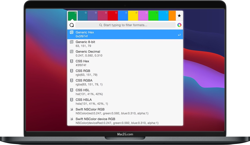 ColorSnapper 2允许您将颜色导出格式与您的编码样式进行匹配。加上所有受支持的新格式,包括 Generic,CSS,NSColor,UIColor,Swift,Android,Java,.NET,CGColor和OpenGL,这将加快开发人员的工作流程。
