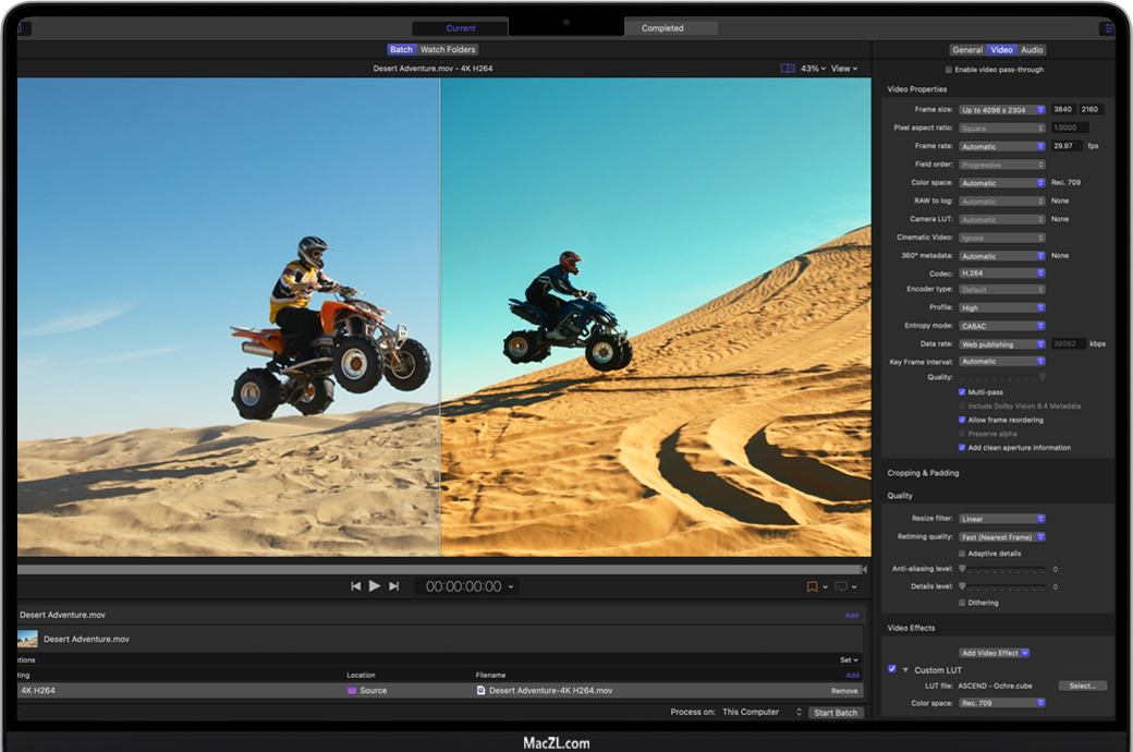 Compressor 善于运用适合 H.264 和 HEVC 导出的硬件编码器,将任务分配到多个中央处理器核心,还能借助显卡上的高速图形处理器,加快完成要求较高的影像处理工作。