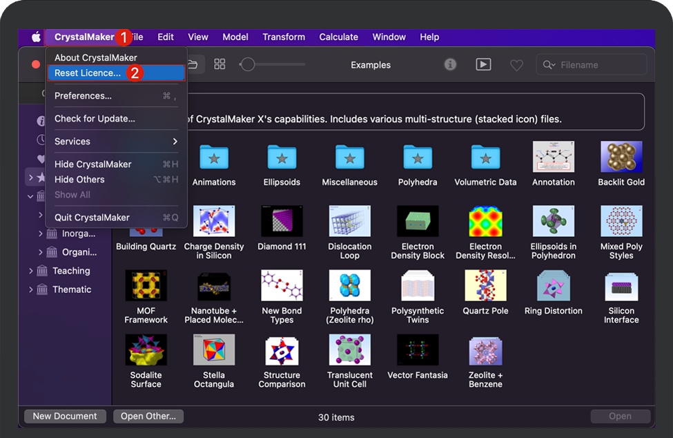 3. 然后依次点击电脑顶部导航栏左上角的“CrystalMaker”→“Reset Licence”。
