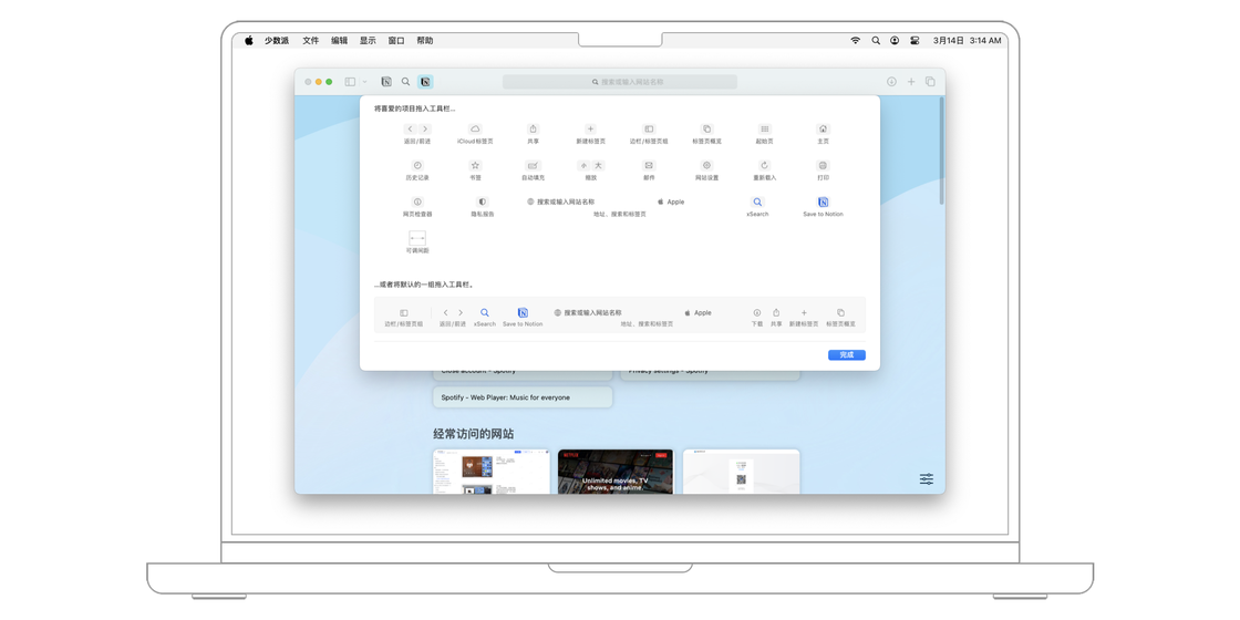 在浏览器的工具栏右键,选择「自定工具栏」,即可打开自定义工具栏的个性化设置模式。你可以将喜爱的项目直接拖入工具栏,摆放成符合自己的使用习惯的样子。