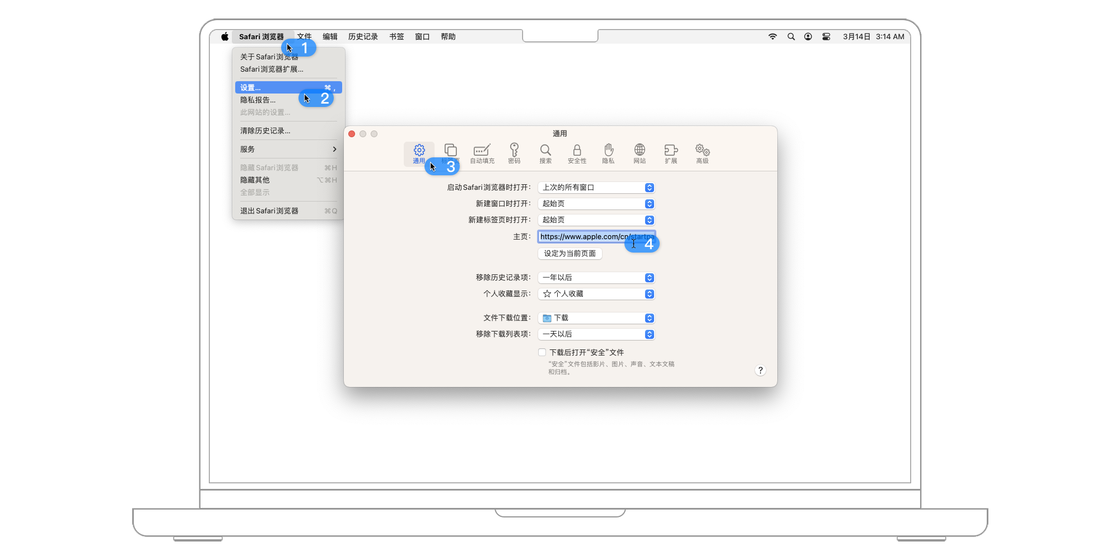 在顶部菜单栏中选取Safari浏览器 > 设置,然后点击「通用」,在主页设置中输入网址即可实现主页设置。