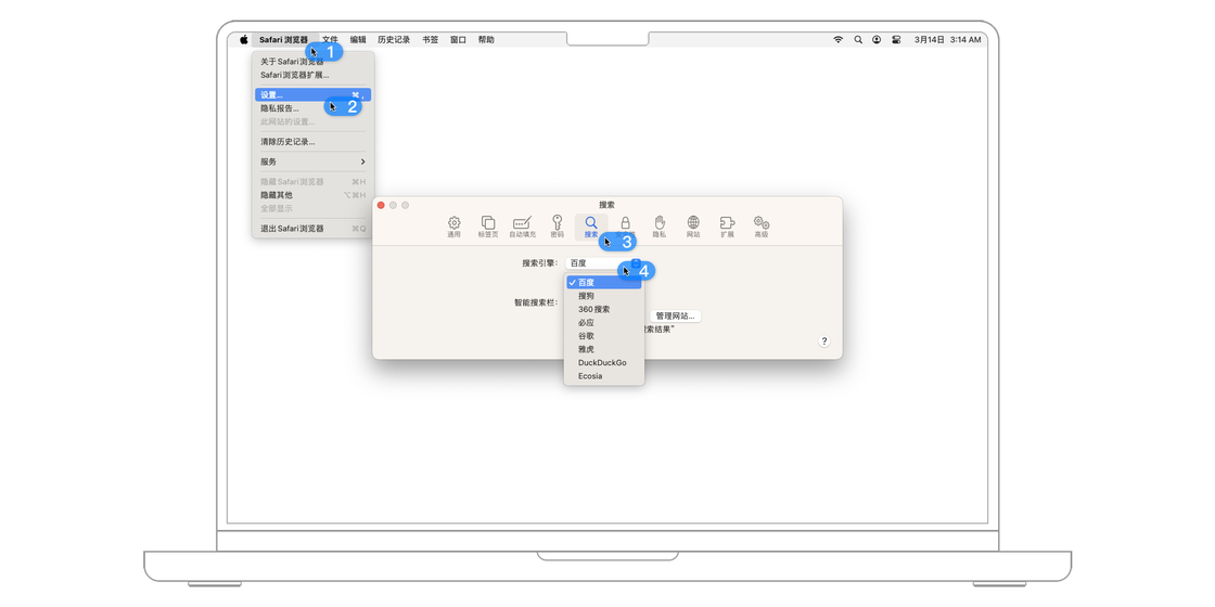 在 Mac 上,选取顶部菜单栏苹果图标 > 系统设置,然后点按「桌面与程序坞」。在「应用程序」分区点按「默认网页浏览器」弹出式菜单并选取「Safari 浏览器」,即可实现将 Safari 设置为默认浏览器的操作。