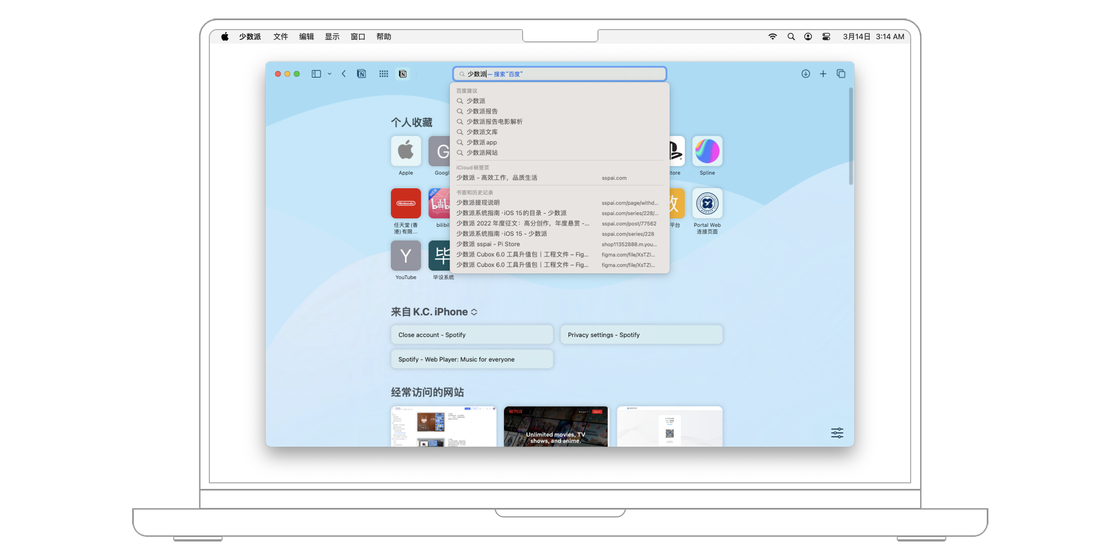 如果你有所留意,会发现 Safari 的搜索栏集成的内容比第三方浏览器更为规整和丰富,当你输入内容或 URL 时,会从「最常点选」「搜索引擎建议」「书签和历史记录」等几个方面给出建议,如果输入内容跟已有的标签页关联,还会显示「切换到标签页」的直达链接。