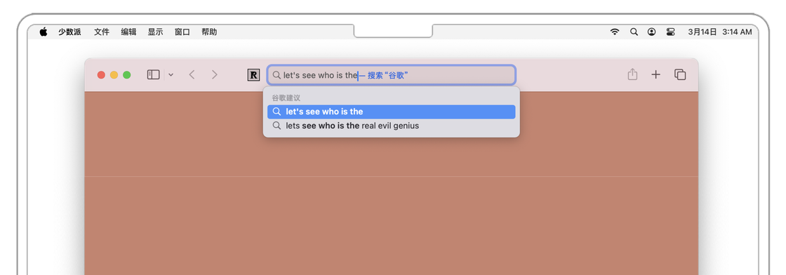在 macOS Sonoma 版本中,苹果进一步优化了 Safari 的搜索体验。首先是搜索速度,在新版本中通过 Safari 的地址栏搜索可以更快地跳转到搜索页面。其次是搜索建议的关联性和可读性也得到了加强,Safari 可以在我输入每一个关键词后及时地更新搜索建议,甚至可以直接在地址栏显示部分搜索结果。比如说,我想搜索一个来自游戏 Dota 2 的名梗,在地址栏中仅输入了前半句就在搜索建议中获得了完全正确的一整句。