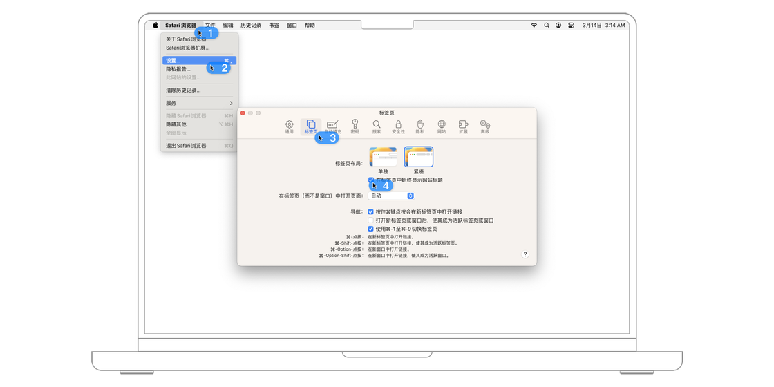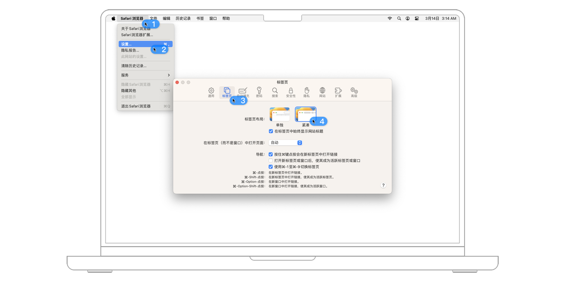 默认情况下,你可以通过按住 ⌘Command 点击链接,来打开新标签页,但需要在Safari浏览器 > 设置 > 标签页中勾选对应配置。
