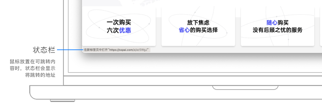 浏览网页时,当鼠标放置在可跳转内容时,可以在状态栏看到即将跳转的地址。你也可以通过显示 > 隐藏状态栏来关闭该效果。