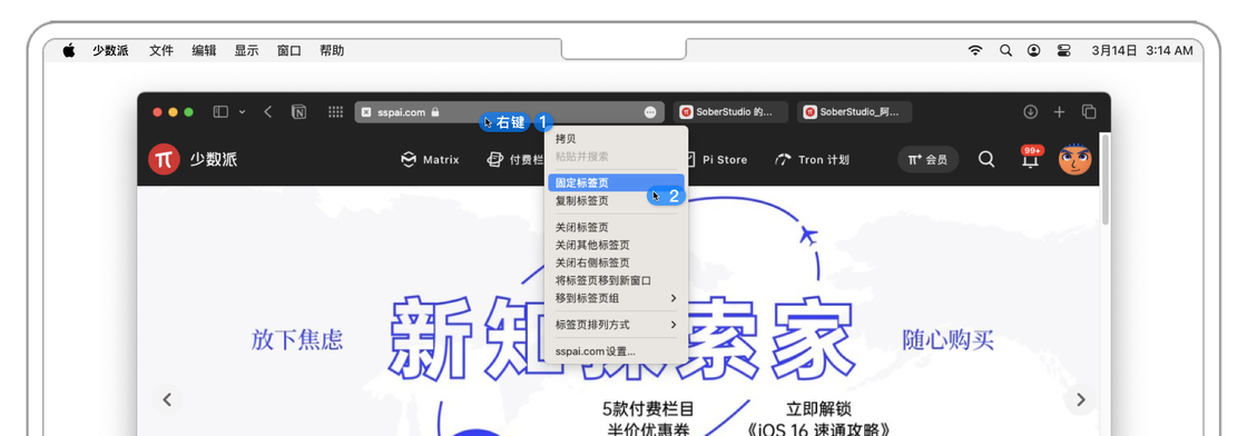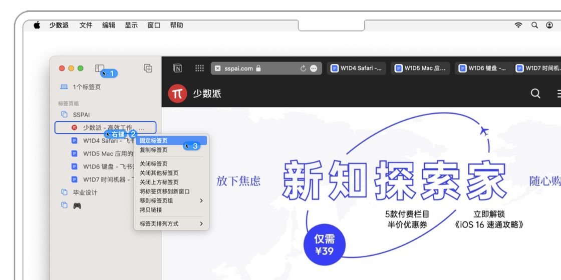 所有的标签页组都可以通过「固定标签页」功能来固定指定的网页,每次切换到该标签页组都会直接打开所有包含的固定标签页。通过 Safari 左上角的按钮,可以直接在各个标签页组之间进行切换,免去了打开侧边栏的麻烦。