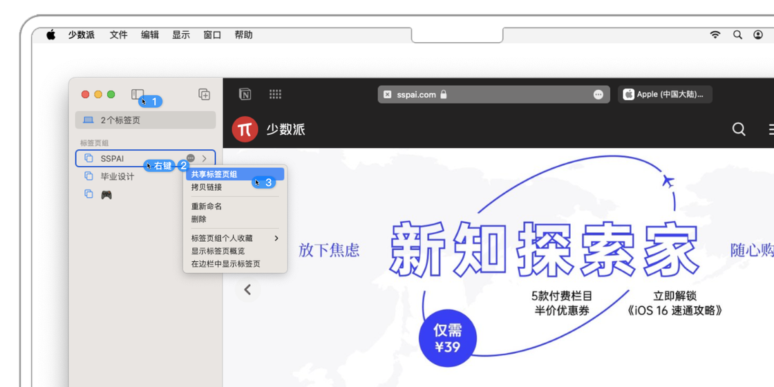 标签页组现在还可以共享给其他 Safari 用户,只需右键点击标签页组名,然后选择「共享标签页组」,就可以通过信息 app 将该标签页组分享给好友。获得协作权限的好友,都能往这个标签页组添加新的标签页,如果标签页有更新也可以实时收到同步。