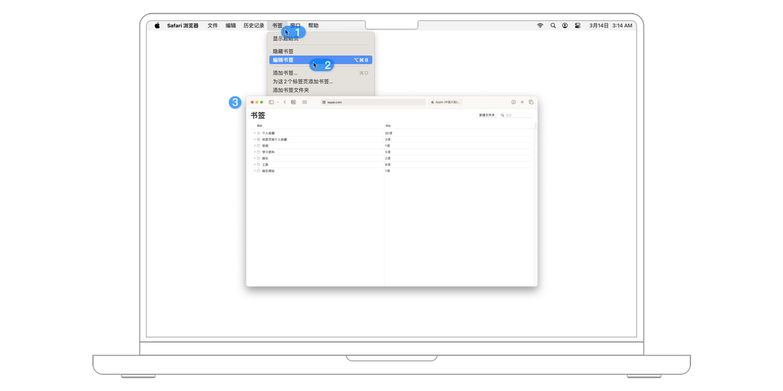 通过点击浏览器工具栏的共享按钮,在下拉菜单中选择「添加书签」,即可将当前网页添加到书签列表中。当需要打开书签时,可以点击工具栏的开关个人收藏夹来快速显示和隐藏收藏夹栏。
