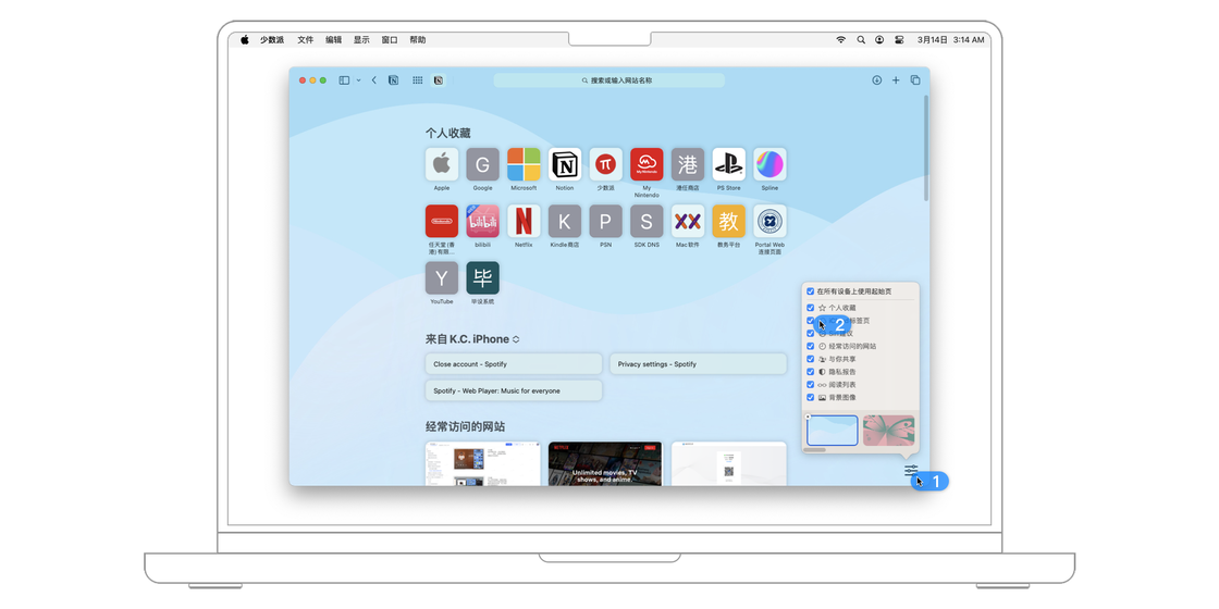 每一个标签页组的起始页都可以进行自定义,一方面是可以选取自己喜欢的壁纸,另一方面是可以自由选择在起始页上显示的元素,包含了个人收藏、经常访问的网站、隐私报告等。