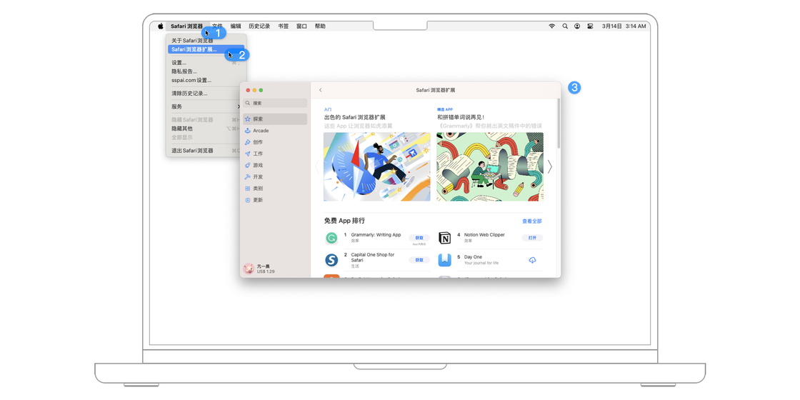 在顶部菜单栏中,点击 Safari 浏览器 > Safari 浏览器扩展,可以自动跳转到 App Store 获取可用的扩展。