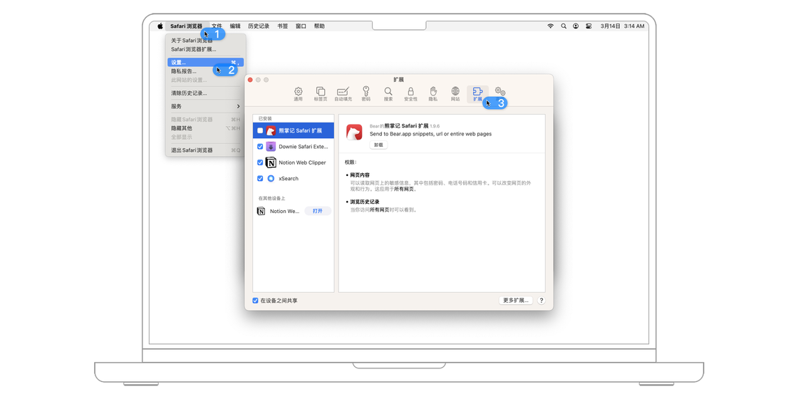 在顶部菜单栏中,点击Safari 浏览器 > 设置,然后点击「扩展」即可查看已经安装的所有扩展,并通过勾选实现扩展的启停,失效的扩展也可以在这里进行卸载。