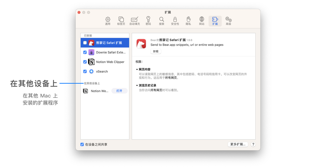 在 macOS 13 版本中,我们还可以在设置中查看来自其他设备的可用扩展。所有扩展在安装后便会开始同步,你只需启用一次即可。对于有多台 Mac 设备的用户来说,这个功能免去了在每台设备上单独配置 Safari 浏览器扩展的麻烦,同时也降低了维护更新的成本。