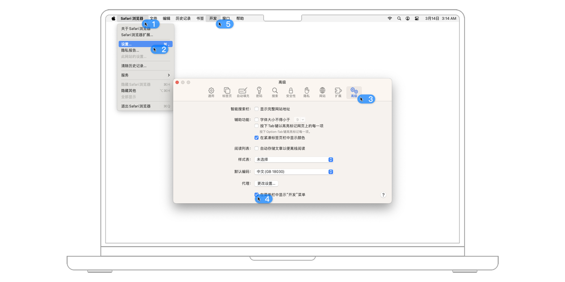 在顶部菜单栏中选取Safari浏览器 > 设置,然后点击「高级」,勾选「在菜单栏中显示开发菜单」,点击开发 > 显示网页检查器或在网页右键选择「检查元素」可以打开开发者模式。