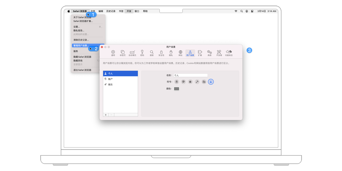 用户场景功能需要通过「Safari 浏览器-设置-用户场景」进行设置,在此可以新增、删除或者编辑用户场景。每一个用户场景可以单独设置名称、符号、颜色、个人收藏以及新建窗口/标签页时打开的页面,设置好后每一个用户场景就相当于一个独立的浏览器沙盒,互不干扰,还可以进行快速切换。