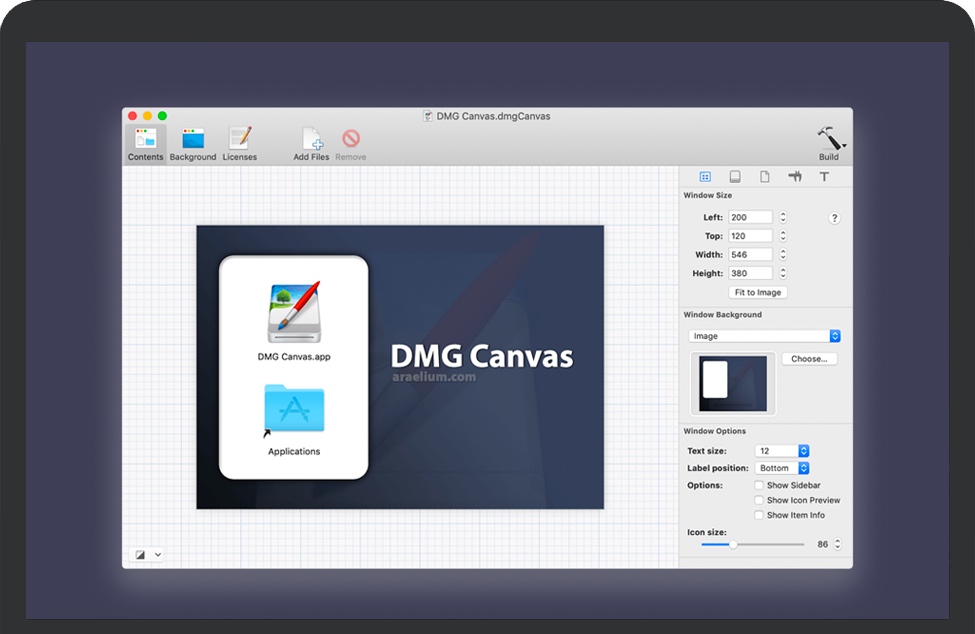 制作磁盘映像应该不难。使用DMG Canvas,只需为您的磁盘图像提供背景图像,将文件拖放到窗口视图中,然后单击构建。您在DMG Canvas中看到的正是它在 Finder 中的样子。