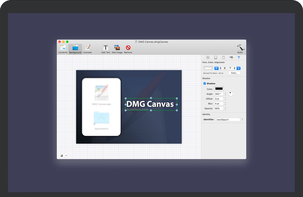 使用背景布局视图,您可以直接在 DMG Canvas 内部为您的磁盘图像创建出色的背景。只需放入图像,添加自定义文本,即可快速完成。