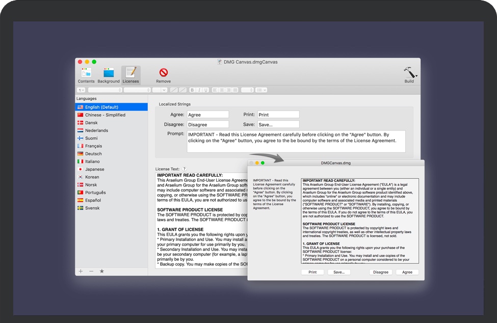 挂载时是否需要磁盘映像来提示许可协议?不是问题。不要花几个小时试图自己弄清楚;只需将您的许可证文本放入 DMG Canvas 中即可完成。它甚至支持样式和多种语言。