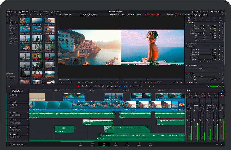 无论是离线剪辑还是在线精编,均能完美胜任。您可使用各种剪辑和修剪工具、堆叠和选项卡式时间线、多机位、隐藏式字幕和字幕工具、屏幕注释、更快的项目加载速度、2D 和 3D 字幕模板以及数十项其他新功能!