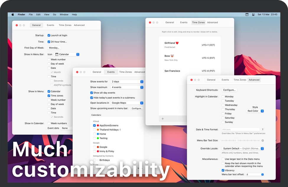 Dato for Mac 在菜单栏中为您提供本地时钟、日期和多个世界时钟。当您单击菜单栏中的 Dato 时,您会看到一个包含日历、日历事件和世界时钟的菜单。所有这些都是高度可定制的。Dato 支持 macOS 支持的菜单栏文本、日期、时间和日历的所有区域设置和语言,但菜单和首选项仅支持英文。Dato仅以英语提供,它将永远不支持农历。