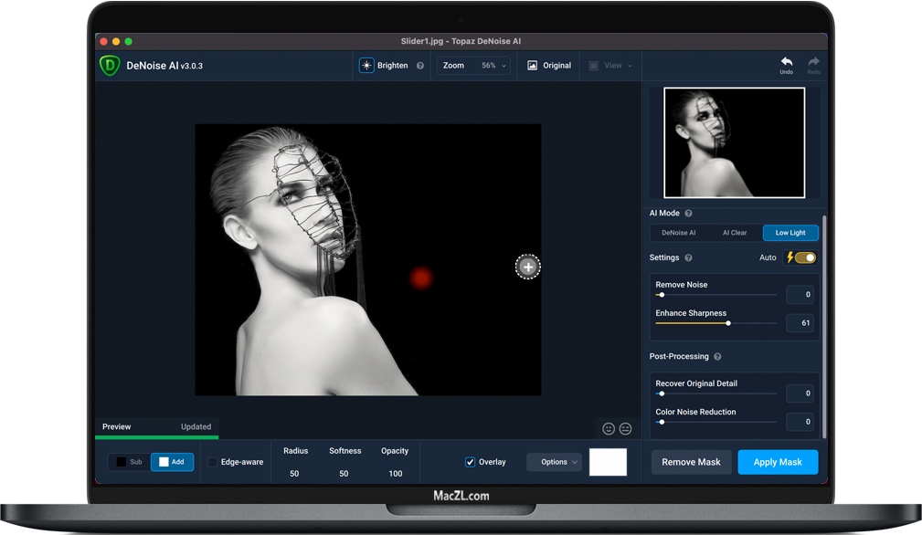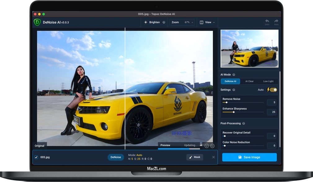 在您的降噪工作流程中,您可能会遇到从某些区域去除噪声效果最好的图像,例如天空但没有碰撞波……在鸟类的光滑羽毛上而不是粗糙的树皮上……在光滑的外皮上汽车,而不是人行道。DeNoise AI允许您有选择地在图像的某些区域应用降噪,并保留其他纹理。