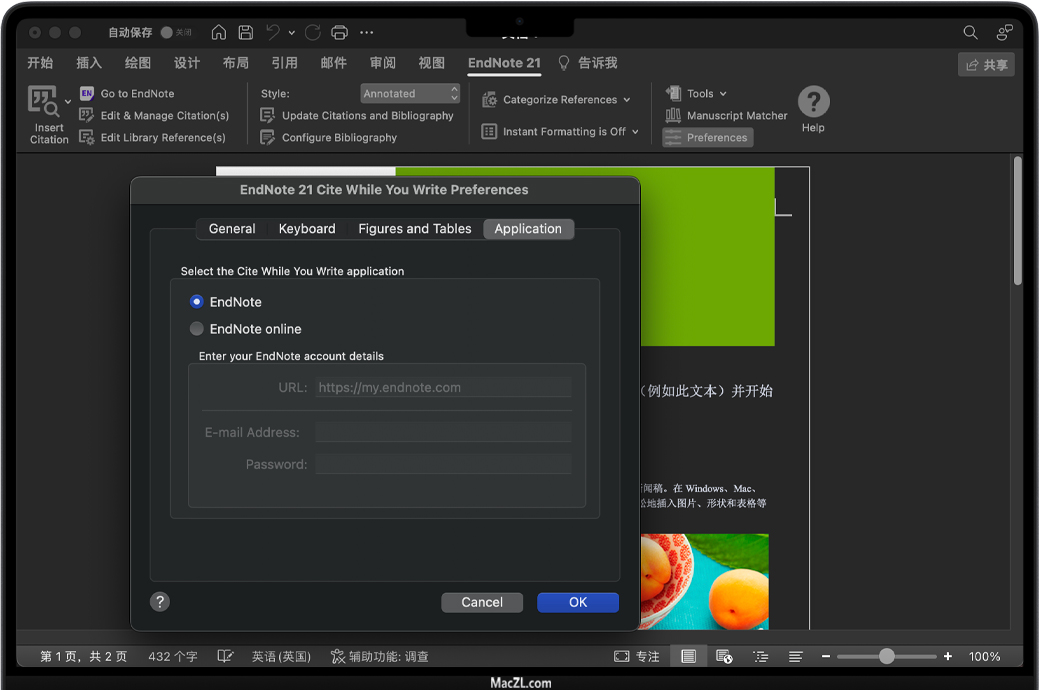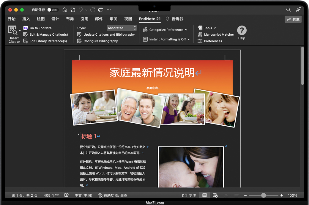 EndNote一流的 Cite While You Write (CWYW) 工具可轻松将 EndNote 参考文献插入 Microsoft Word或 Apple Pages。CWYW 可自动创建文内引用和参考文献列表,并可轻松更改文内引用和参考文献列表的格式。