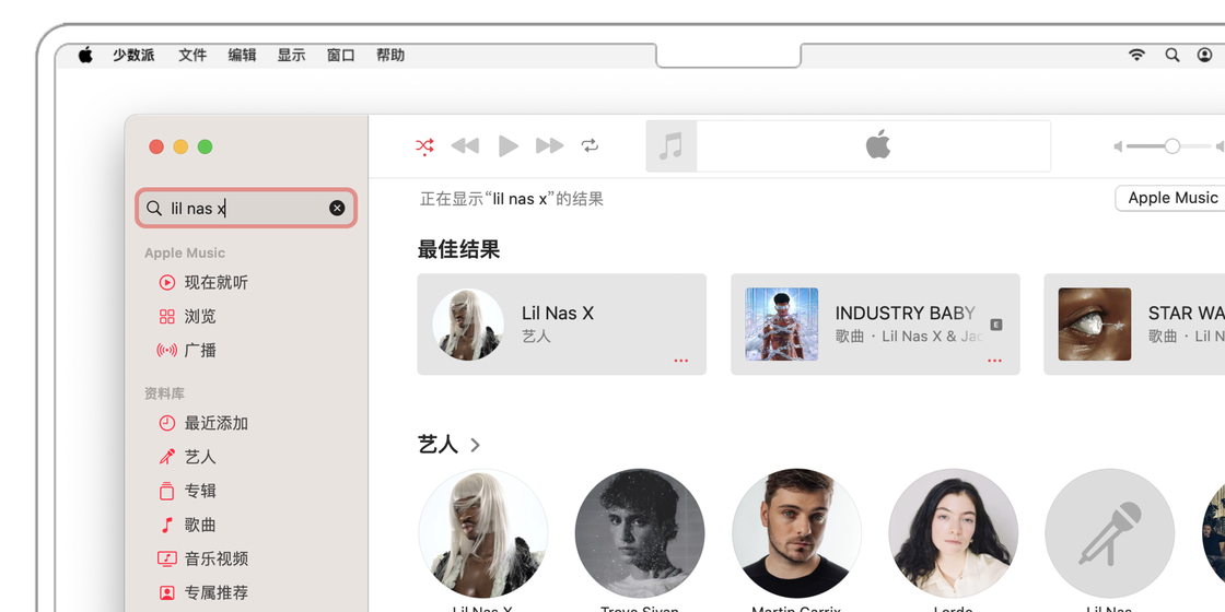 在 Apple Music 的左侧边栏顶部便是「搜索框」,支持搜索艺人、歌曲、歌词等内容。输入之后,候选窗口默认会出现在「Apple Music」和「您的资料库」两种不同位置的结果,前者对应的是在音乐库中进行搜索的结果,后者则是在用户已经存储的线上或本地资料库中的结果。当然,我们也可以通过呼叫 Siri 来进行搜索的操作。