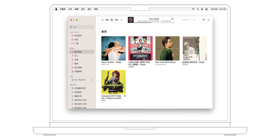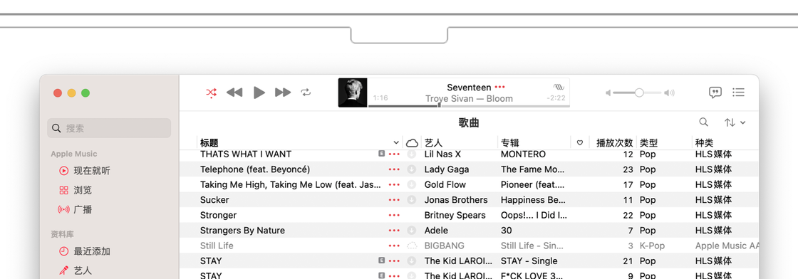 打开 Apple Music 的资料库,将想要添加的本地音乐文件直接拖进去,就可以在资料库中看到它了。此时拖进来的文件仍存在本地,如果想在 iPhone、iPad 或者其他设备聆听自己上传的歌曲,需要打开「同步资料库」的功能。
